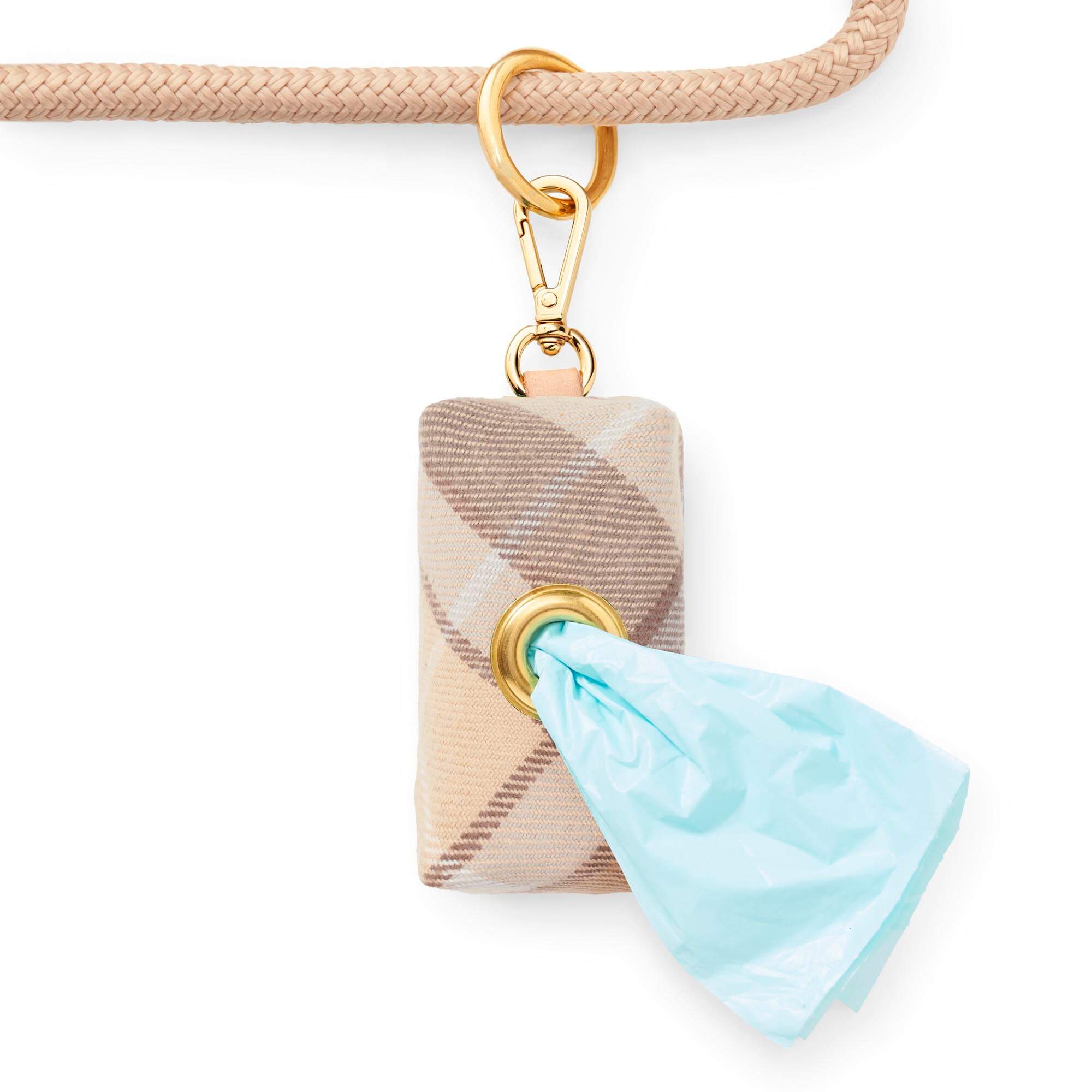 Beige flannel poop bag holder makes chic happen when sh*t happens!